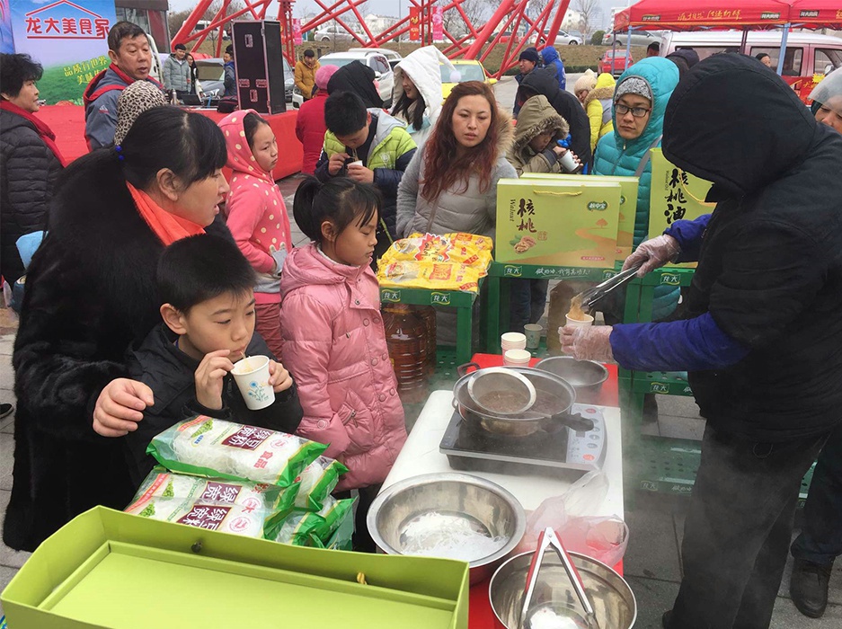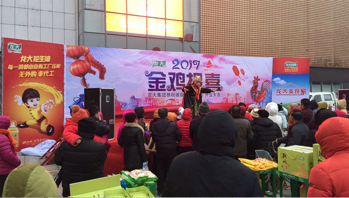 1月7日—9日,銀座萊陽店門前廣場喜氣洋洋。龍大集團(tuán)組織旗下植物油、肉食品兩大內(nèi)貿(mào)產(chǎn)品進(jìn)行為期3天的路演,為銀座萊陽店開業(yè)助力。