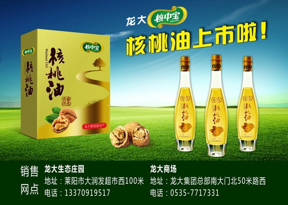 龍大“核中寶”核桃油上市了。核中寶核桃油精選龍大自有基地生產的核中寶核桃,嚴格按照龍大蔬菜基地“五統一”管理模式進行管理、生產,綠色、安全、健康、營養。