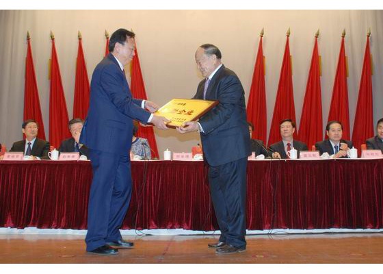2月24日,萊陽市委市政府在工人文化宮召開總結表彰和新年度動員大會。會上,表彰了全市先進企業和先進單位。圖為萊陽市委書記賀業增(左)為龍大集團頒發“功勛企業”獎牌。